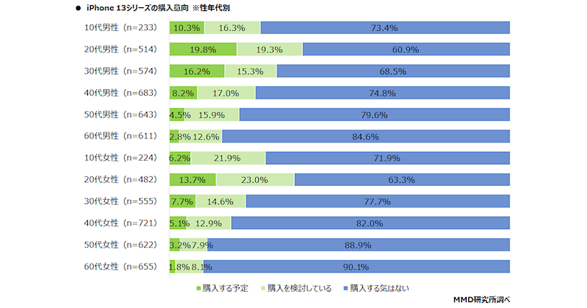 MMD研究所は、「iPhone 13シリーズに関する購入意向調査」の結果を発表した。9月に発売されたアップルiPhone 13シリーズについて、15歳~69歳の男女6,517人を対象にアンケートを2021年10月19日(火)行っている。