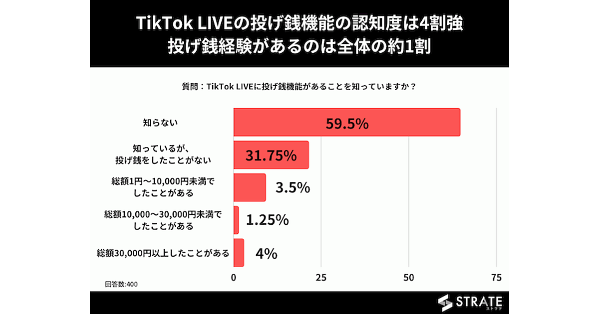 まず全国の20代~30代の男女400人に、「TikTok LIVEの投げ銭機能の認知」を聞くと、「知らない」は59.5%で、残る40.5%が投げ銭機能を知っていた。