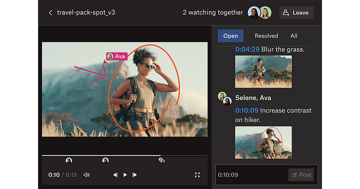 Dropboxやパソコン上の動画を簡単に追加して高画質なプレイヤーで視聴する。ワンクリックでリンクを作成してチームメンバーやクライアントと人数制限なしで動画を共有できる。共有相手にDropboxアカウントは不要。動画フレーム(静止画像の1コマ)単位でコメントや注釈を残せるので、指摘対象を正確に把握できる。ライブレビュー機能で参加者全員が同じ場面を同じタイミングで視聴する試写室をバーチャルに再現できる。