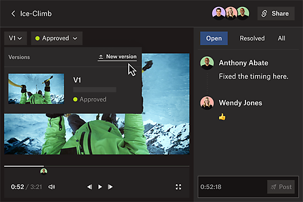 動画制作のプロジェクトの進捗を管理する機能も備える。プロジェクトフォルダで目的のファイルをすぐに見つけることができ、Replayのリンクを関係者に共有して承認を求めることができる。承認を得るために動画を圧縮してメールに添付する手間はない。ステータス設定でレビューが必要か、作業進行中か、承認が済んだかが一目で分かる。過去のバージョンを管理しながら新しいバージョンをアップロードすることができる。