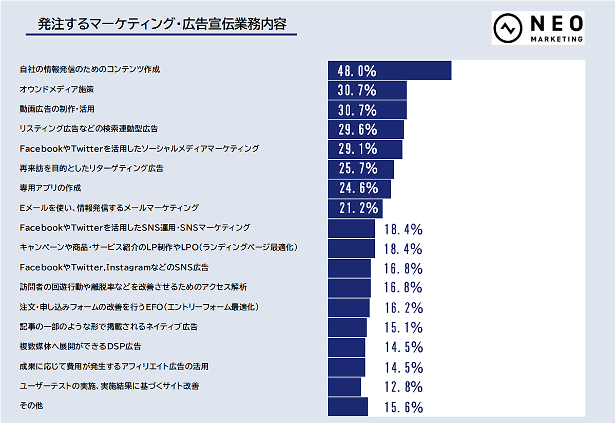 まずは「発注することがあるマーケティング・広告宣伝の業務内容」を聞くと、「自社の情報発信のためのコンテンツ作成」48.0%が特に多く、「オウンドメディア施策」「動画広告の制作・活用」各30.7%が同率で2位だった。さらに微差で「リスティング広告などの検索連動広告」「FacebookやTwitterを活用したソーシャルメディアマーケティング」が続く。