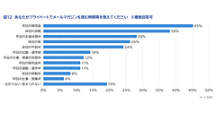 なお「一番よく読んでいるメールマガジンの配信頻度」を聞くと、「不定期」57.9%が最多で、「週刊」25.7%、「日刊」12.1%、「月刊」4.3%がそれに続いた。また「一週間のうちでメールマガジンをよく読む曜日」では「土曜日」55.4%でトップ、「一日のうちでメールマガジンをよく読む時間帯」では「21時~24時頃」48.2%がトップだった。