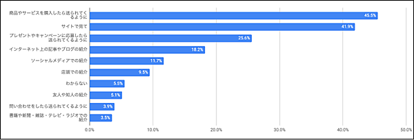 「メールマガジンを読むようになったきっかけ」について聞くと、「商品やサービスを購入したら送られてくるようになった」45.5%、「Webサイトで見て登録した」41.9%が上位だった。なお前年の調査では「Webサイトで見て登録した」が1位で、今回入れ替わったこととなる。