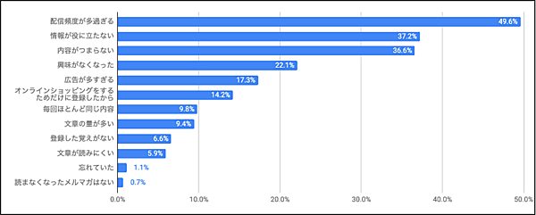 一方、「メルマガに対する不満」(メールマガジンを読まなくなった理由)を聞くと、「配信頻度が多すぎる」49.6%、「情報が役に立たない」37.2%、「内容がつまらない」36.6%が上位で、配信頻度と配信内容に対する不満が上位だった。