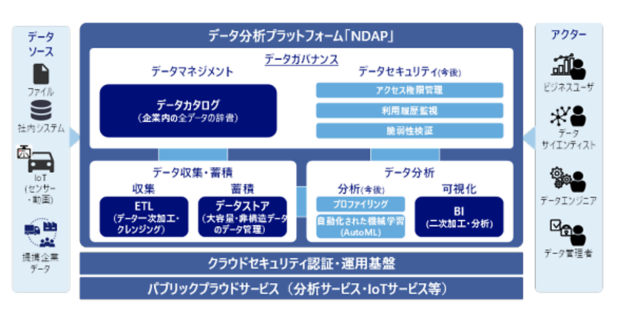 損害保険の契約情報、事故・支払い情報、運転中の運転挙動・道路・天候などセンサーやカメラからの膨大なデータが分析対象に含まれる。データの構造や管理体系が異なる大量のデータを相互に関連付けるため、データカタログ機能、データ収集・加工・蓄積・分析にまたがるデータマネジメント機能を中心にした。NRIのデータ分析プラットフォーム「NDAP」を利用して6カ月で構築した。