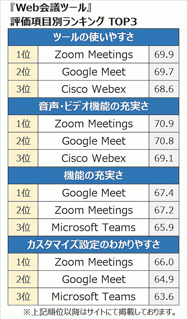 2位は「Google Meet」(グーグル)69.6点で、項目別では「機能の充実さ」「コストパフォーマンス」が1位だった。
