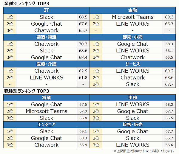 なお業種別で見ると、ITでは「Slack」、金融では「Microsoft Teams」、サービスでは「LINE WORKS」がそれぞれ1位になるなど、かなりの違いを見せている。付加機能や周辺企業の利用などで偏りが発生しているようだ。