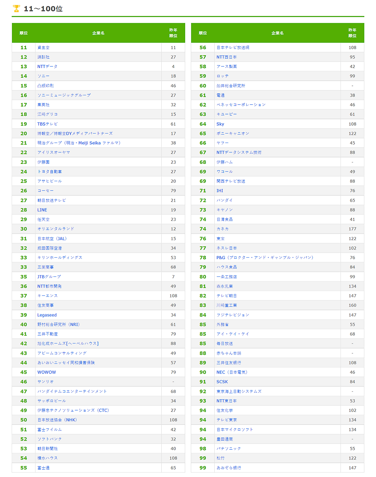 2位には前年3位の「味の素」、3位には前年5位の「伊藤忠商事」がランクインした。そのほかトップ10を見ると、かなり順位が入れ替わっており、前年26位の「旭化成」が10位まで上昇している。逆にコロナ禍の影響があったのか、前年7位の「JTBグループ」は35位と大きくランクダウンしている。「オリエンタルランド」も前年12位から30位に下降した。