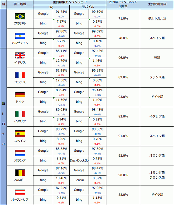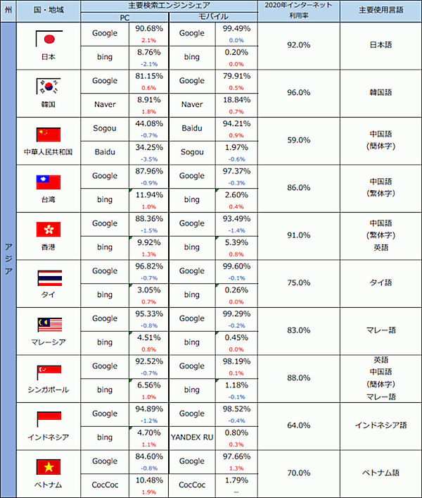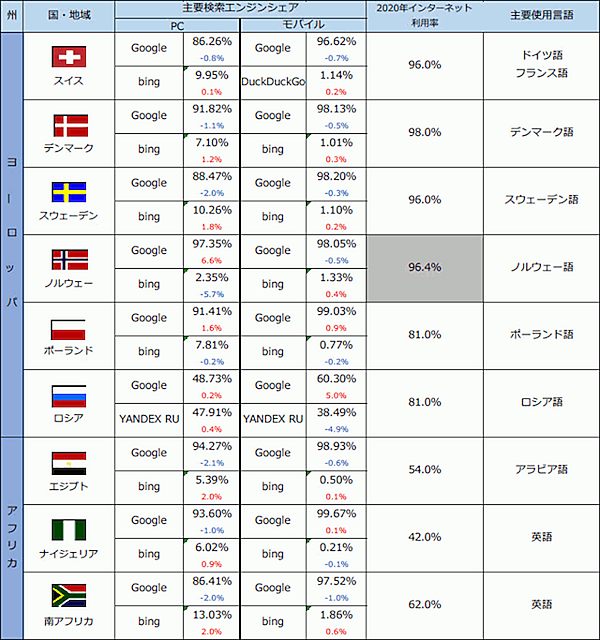 アウンコンサルティングは、2021年8月時点における、世界40か国・地域の主要検索エンジンシェアに関する調査結果を発表した。同社ではほぼ半年ごとに各国のインターネット利用率、検索エンジンシェアの変化を集計している。前回調査は2021年3月。