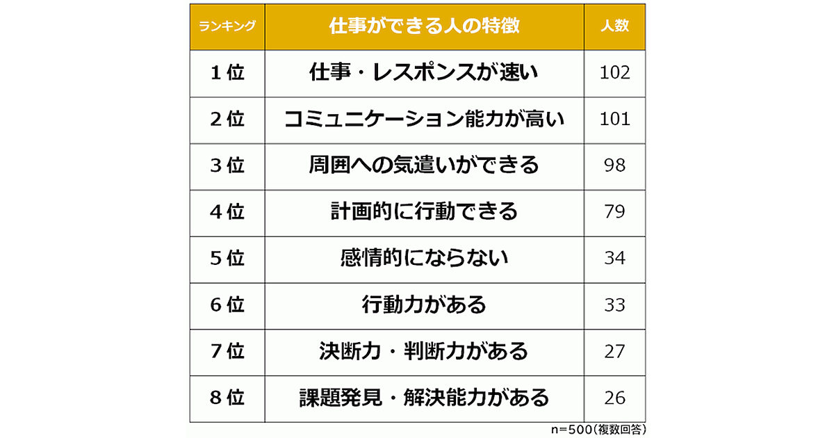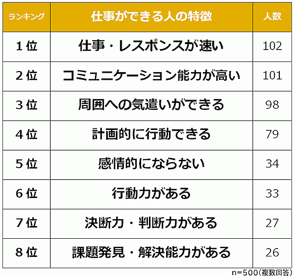 まず「身近にいる仕事ができる人の特徴」を聞くと、「仕事・レスポンスが速い」102人が1位、1人差で「コミュニケーション能力が高い」101人が2位だった。以下「周囲への気遣いができる」「計画的に行動できる」「感情的にならない」が続いた。