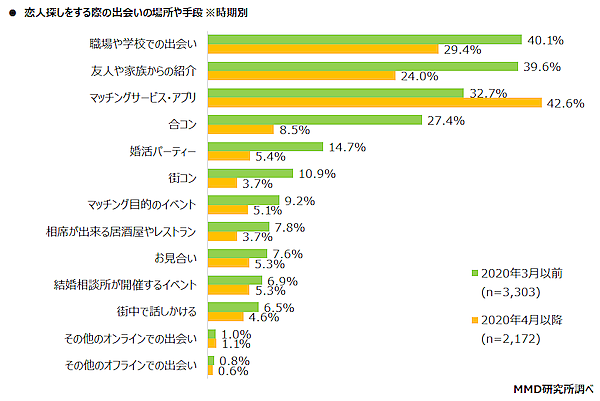 そこで、あると回答した5,475人に「恋人探しをする際の出会いの場所や手段」を聞くと、2020年3月以前は「職場や学校での出会い」40.1%、「友人や家族からの紹介」39.6%がトップ2だったが、2020年4月以降は「マッチングサービス・アプリ」42.6%、「職場や学校での出会い」29.4%と大きく変化していた。