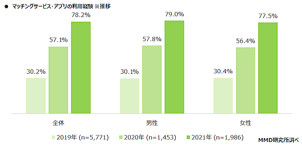 次に、恋人探しをしたことがある3,366人に「マッチングサービス・アプリを知っているか」を聞くと、「知っている」59.0%、「名前だけ聞いたことがある程度」28.6%となった。認知者1,986人に利用経験を聞くと、「現在利用している」32.6%、「過去に利用していた(現在利用していない)」45.7%だった。2019年・2020年調査と比較して、男女ともに利用者は急増している。