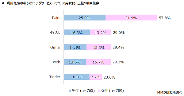 マッチングサービス・アプリを利用したことがある1,554人に、利用経験のあるマッチングサービス・アプリを具体的に聞くと、「Pairs」57.8%(男性25.9%、女性31.9%)が圧倒的な支持を集めて1位となった。2位には「タップル」29.5%がランクインし、僅差で3位「Omiai」29.4%が続いた。男女比で見ると、「Pairs」は女性が、「タップル」は男性の利用経験が上回っている。