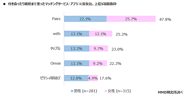 こうしたマッチングサービス・アプリが、どれだけ交際・結婚に結び付いたかを聞くと、「ある」38.4%、「ない」61.6%で、やや微妙な様子がうかがえる。具体的に「交際や結婚に至ったマッチングサービス・アプリ」を聞くと、「Pairs」47.8%の1位は変わらなかったが、「with」25.2%、「タップル」23.0%となり、成果では違いが現れた。