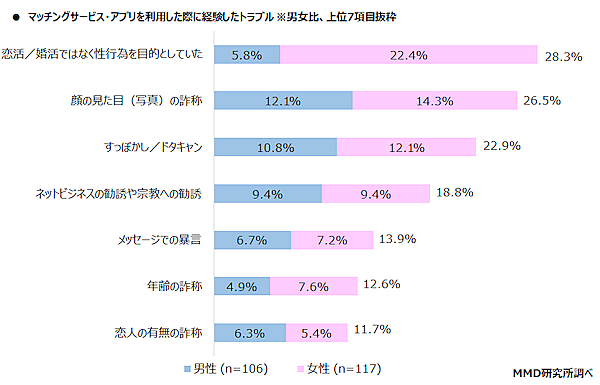 一方、利用経験者500人に「マッチングサービス・アプリでトラブルを経験したことがあるか」を聞くと、「ある」44.6%、「ない」55.4%で半数近くがトラブルに遭遇していた。具体的な内容では「恋活/婚活ではなく性行為を目的としていた」28.3%、「顔の見た目(写真)の詐称」26.5%、「すっぽかし/ドタキャン」22.9%が上位となっている。自由意見では、「ネットビジネスの勧誘や宗教への勧誘だった」「メールアドレスやLINE IDを回収する業者だった」「マルチ商法に勧誘された」といった声もあがっている。