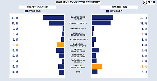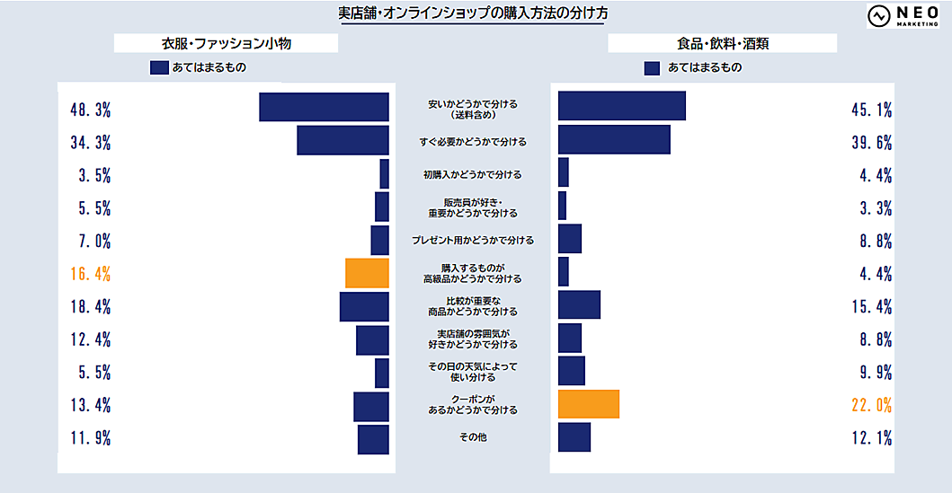 なお「衣服・ファッション小物」については、「購入するものが高級品かどうかで分ける」16.4%で、他のジャンルと比較して高く、ブランドへのこだわりが見える。「食品・飲料・酒類」は、「クーポンがあるかどうかで分ける」が高めだ。