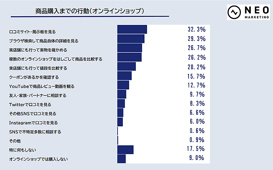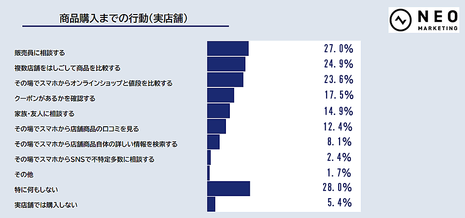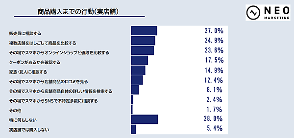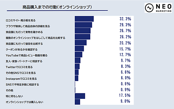 なお「実店舗での商品購入までの行動」「オンラインショップでの商品購入までの行動」をそれぞれ聞くと、実店舗では「販売員に相談する」27.0%、「複数店舗をはしごして商品を比較する」24.9%、「その場でスマホからオンラインショップと値段を比較する」23.6%が上位だった。一方オンラインショップでは「クチコミサイト・掲示板を見る」32.3%、「ブラウザ検索して商品自体の詳細を見る」29.3%が上位だった。