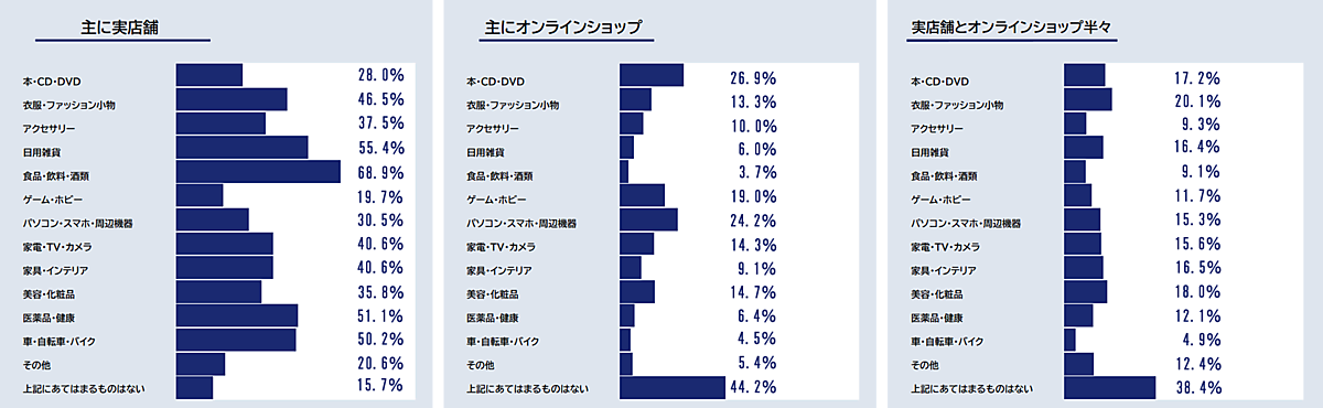 まず「ふだんの買い物の購入場所」を聞くと、「本・CD・DVD」「ゲーム・ホビー」「衣服・ファッション小物」「食品・飲料・酒類」「家電・TV・カメラ」「美容・化粧品」といったジャンルにかかわらず、すべてで「主に実店舗」が最多だった。書籍ではアマゾンの浸透がよく話題になるが、まだまだ実店舗が優勢だと言える。ただし「本・CD・DVD」の差は1ポイント前後で、どちらも人気だと言える。