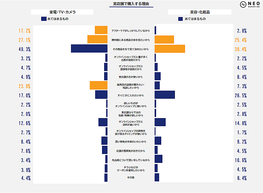 ジャンル別だと、「衣服・ファッション小物」「食品・飲料・酒類」は「その商品を生で見て決めたいから」が最多だ。ただし食品・飲料・酒類では、わずか1ポイント差の41.7%で「すぐに手に入れたいから」が2位に続く(衣服・ファッション小物では35.1ポイント差)。“食料品は実店舗”という優位性は当面変わらないだろう。また「家電・TV・カメラ」では「販売員の説明が聞きたい」が高い。