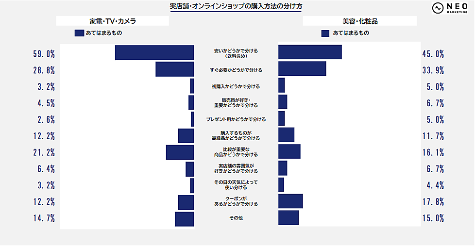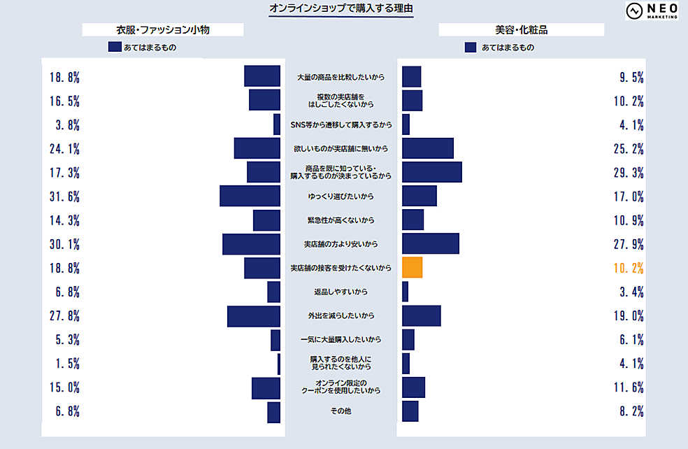 逆に主にオンラインショップで購入すると回答した人に、「オンラインショップで購入する理由」を聞くと、「衣服・ファッション小物」「美容・化粧品」では、「接客を受けずに比較したい」「ゆっくり選びたい」といった理由があがっており、対面接客が苦手な人が活用していると考えられる。一方「パソコン・スマホ・周辺機器」「家電・TV・カメラ」では、圧倒的に「実店舗の方より安いから」が多かった。