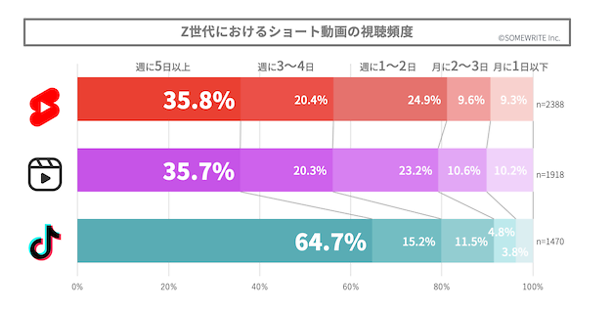そこで、各サービスの利用者に「ショート動画の利用頻度(視聴頻度)」を聞くと、「YouTubeショートを週5日以上視聴している」という人が35.8%、「Instagramリールを週5日以上視聴している」が35.7%存在し、「TikTokを週5日以上視聴している」という人は64.7%にまで達していた。Z世代は、動画とくにショート動画を愛用していると言っていいだろう。YouTubeショート/Instagramリールに絞っても、利用率は7割近い。