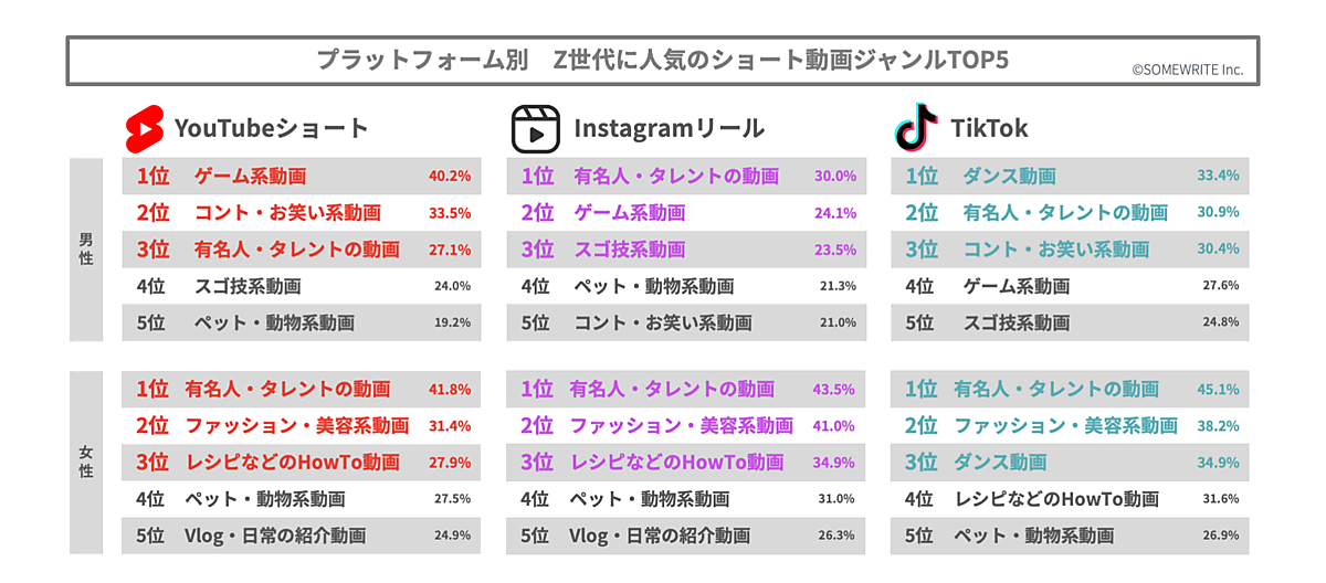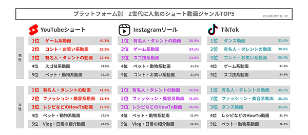男女別で見ると、YouTubeショート、Instagramリール、TikTokいずれでも、女性ユーザーは「ファッション・美容」「HowTo動画」など役立つ情報系のニーズが高かった一方、男性ユーザーは「コント・お笑い」「スゴ技」「ゲーム」などエンタメコンテンツが高かった。