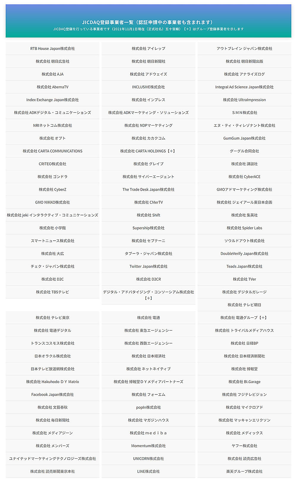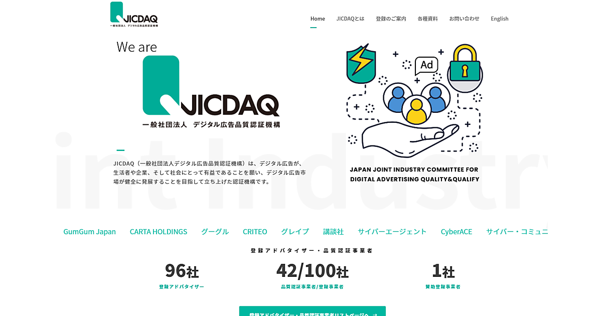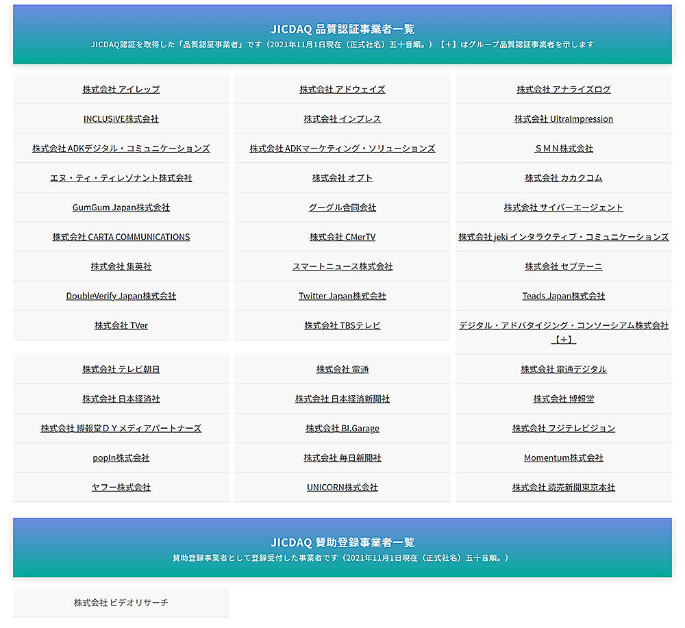 デジタル広告の品質を認証する機関で一般社団法人のデジタル広告品質認証機構(JICDAQ)は、「JICDAQ認証」の公開を11月1日から始めた、と同日発表した。JICDAQの定めるデジタル広告の品質に関する業務プロセスの認証基準を満たした事業者をJICDAQのWebサイトに「品質認証事業者」としてリスト掲載した。認証基準を満たした事業者は「認証マーク」を使用することができる。認証の有効期間は1年間。