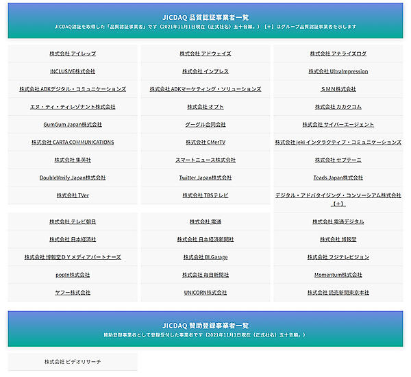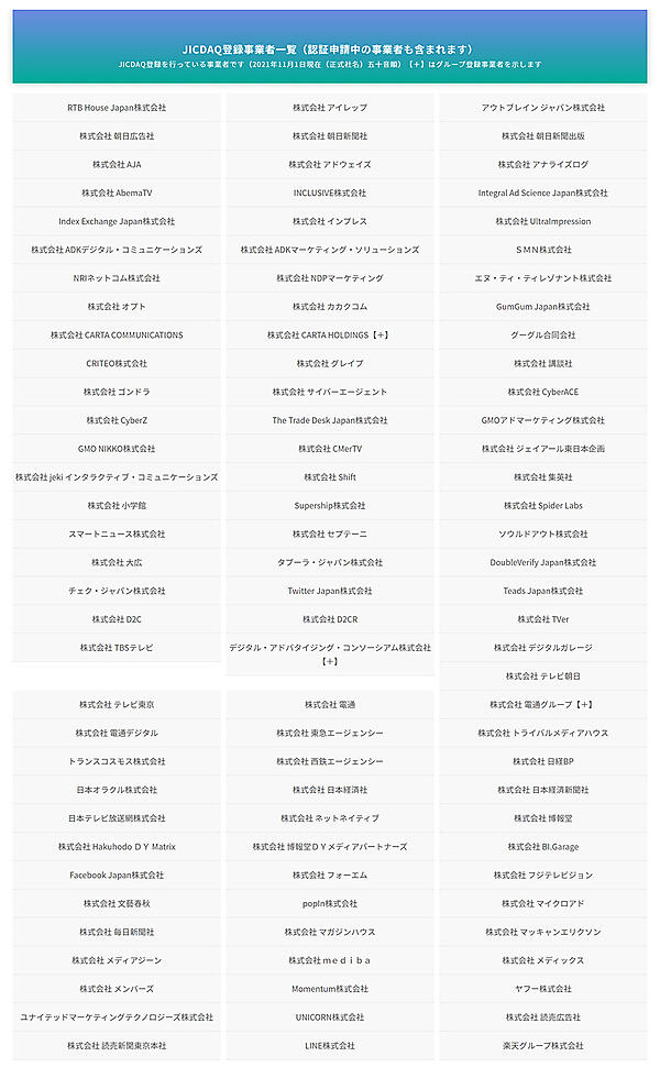 JICDAQの認証基準は、①アドフラウド(広告詐欺)を含めた無効配信を除外する「無効トラフィック対策認証」②ブランドを損なうサイトへの広告掲載防止する「ブランドセーフティ認証」の2種類で、それぞれ「第三者検証」「海外認証」「自己宣言」があるので、計6種類の認証が内容に応じて付与される。新たに認証されるたびにリストは随時追加・更新される。事業者は更新のための第三者検証か自己宣言の認証が必要になる。