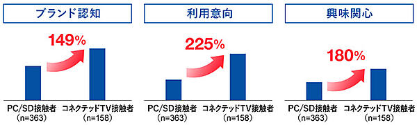 接触者の属性やブランド評価への効果検証など、クライアント企業の目的に応じて自由に調査項目を設定することができる。7月にTBSテレビで調査した際には、コネクテッドTVで配信したTVer広告は、PCやスマートデバイス(SD)で配信したTVer広告と同等の広告認知を得られた。「ブランド認知」「利用意向」「興味関心」などの態度変容でもPCやSDの約150~225%と高い広告効果が確認できたという。