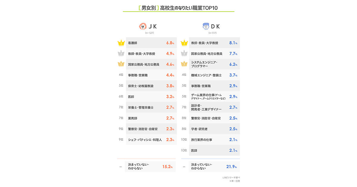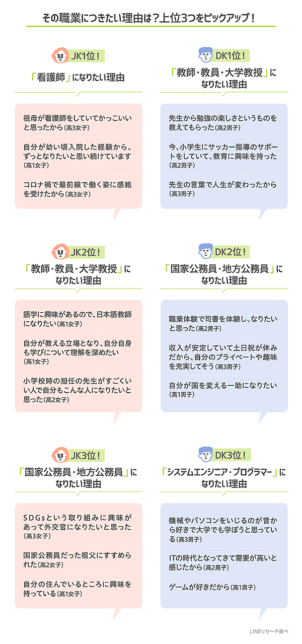 高校生がなりたい職業、学年が上がるにつれ明確に? 高校1年・2年・3年で1位はすべてバラバラ【LINEリサーチ調べ】