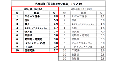 トップ10にランクインしている職業を見ると「国家資格」が必要な職業が多い。収入面・安定性もあるが、そうした職業になりたいものが多いという側面もありそうだ。また女子では「警察官・消防官・自衛官」、男子では「学者・研究者」が圏外から新たにトップ10にランクインしている。