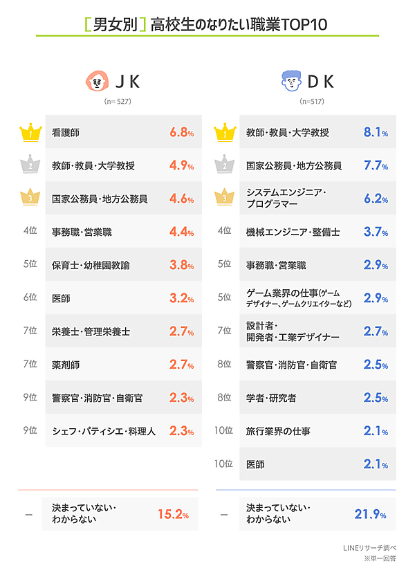 まずは高校生に「将来いちばんなりたい職業」を聞くと、男子高校生(DK)のトップ3は「教師・教員・大学教授」「国家公務員・地方公務員」「システムエンジニア・プログラマー」、女子高校生(JK)のトップ3は「看護師」「教師・教員・大学教授」「国家公務員・地方公務員」だった。女子高校生のトップ3の順位は前年と同じだが、男子高校生では前年3位の「教師・教員・大学教授」が1位にランクアップした。