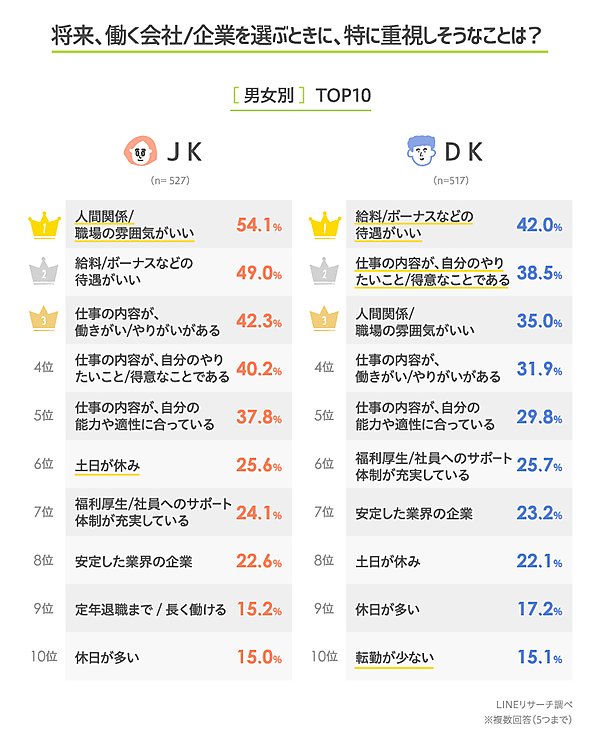 女子は「人間関係/職場の雰囲気がいい」54.1%、男子は「給料/ボーナスなどの待遇がいい」42.0%が1位だった。また女子9位には男子ランク外の「定年退職まで/長く働ける」15.2%がランクイン、男子10位には女子ランク外の「転勤が少ない」15.1%が入っており、傾向差がうかがえる。