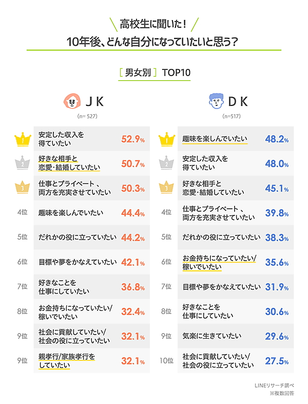 LINEの調査サービス「LINEリサーチ」は、日本全国の高校1年生~3年生を対象に、「なりたい職業」に関するアンケート調査を実施した。将来なりたい職業、その職業になりたい理由、働く会社/企業を選ぶときに重視すること、10年後の自分などについて、1,044人から回答を得ている。