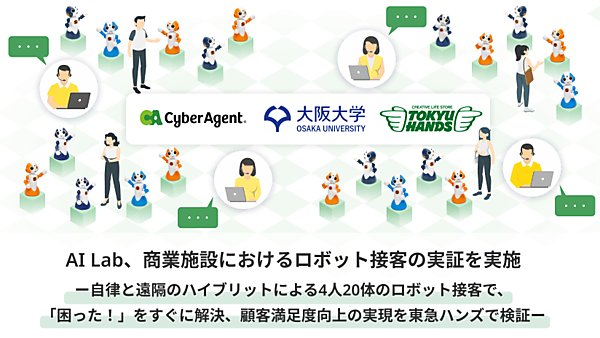 サイバーエージェントの研究開発組織「AI Lab」と、大阪大学大学院基礎工学研究科「先端知能システム(サイバーエージェント)共同研究講座」、東急ハンズは、「ロボットによる次世代サービスの実現」の実証実験プロジェクト第3弾を東急ハンズ心斎橋店(大阪市中央区)で行う、と11月4日に発表した。売り場の複数箇所に設置した遠隔対話ロボット20体をオペレーター4人が操作して接客し、顧客満足度を向上できるかを検証する。