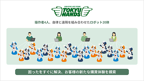 「商品の場所がわからない」「おすすめの商品を知りたい」などの顧客の困りごとを20体の遠隔対話ロボット接客で解決して、「多接点での迅速な質問対応」と「きっかけの提供」が顧客の満足度や新たな購買体験を創出できるかを調べる。東急ハンズのスタッフではないオペレーター4人によるロボット接客が、東急ハンズの熟練スタッフに比べてどの程度パフォーマンスを発揮するか比較する。実証実験は11月18日から29日まで。