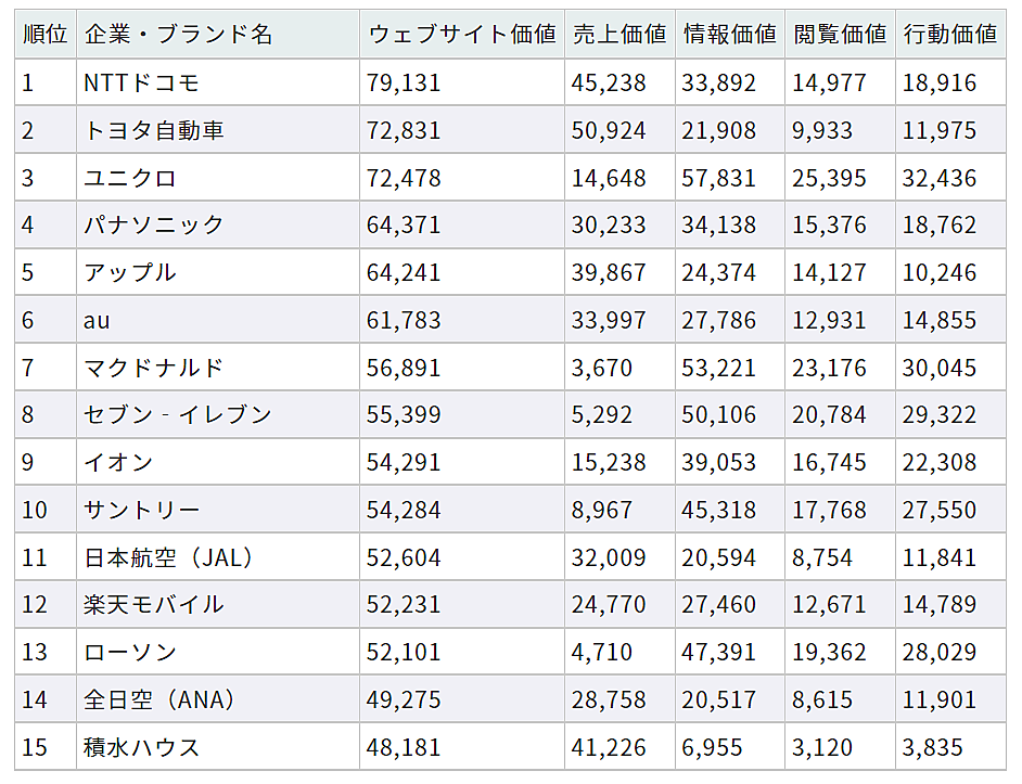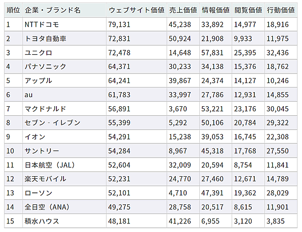 新たに1位になったのは、2020年では7位だった「NTTドコモ」で、ウェブサイト価値は791億3,100万円と算定された。以下「トヨタ自動車」728億3,100万(前年4位)、「ユニクロ」724億7,800万(前年4位)だった。NTTドコモは、安価な新料金プラン「ahamo」がネット限定だったことなどから、デジタルメディアの役割がさらに高まったようだ。