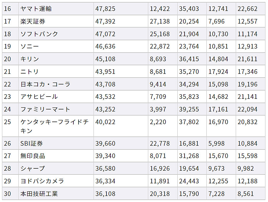 その他30位までのランクイン企業・ブランドは以下のとおり。上位には情報・通信、自動車、流通、電子・電機、食品・飲料、運輸・レジャーなどの業界が並んだ。