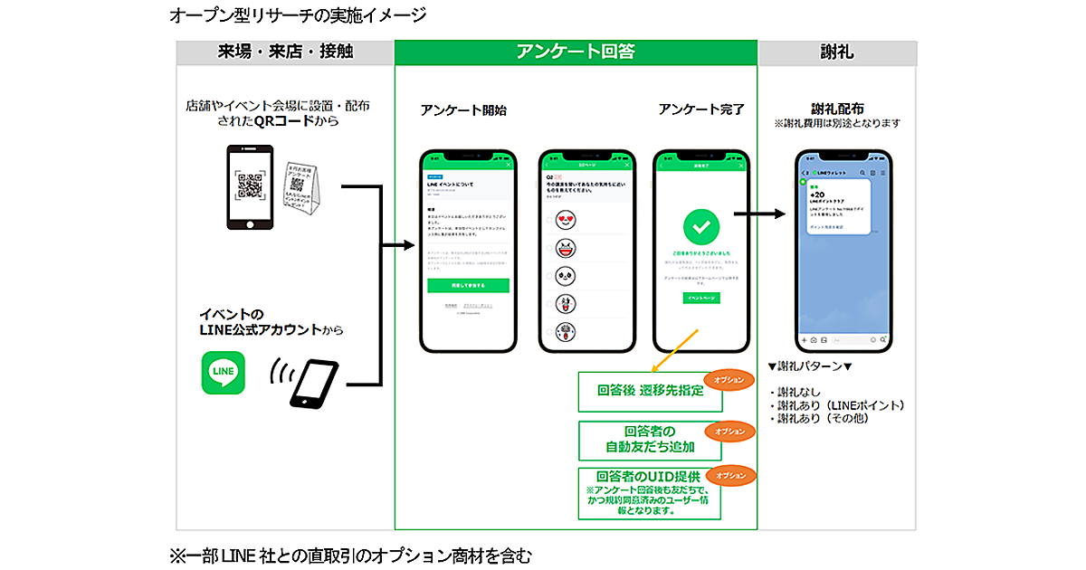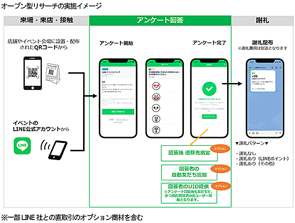 LINEリサーチのオープン型リサーチは、回答謝礼としてLINEポイントを進呈できる。LINEポイントは回答者の個人情報を聴取することなく進呈可能で回答率の向上が期待でき、企業は回答者の個人情報を管理する手間も省ける。回答者にアンケート実施企業の「LINE公式アカウント」を自動友だち追加するオプションや、回答結果をリアルタイムで確認できる機能を併用することできる。