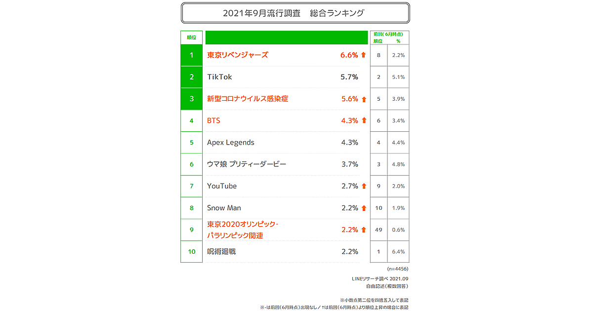 ランキングは以下、「TikTok」「新型コロナウイルス感染症」「BTS」「Apex Legends」「ウマ娘 プリティーダービー」が続いており、前回1位の「呪術廻戦」も10位となっている。全体的に安定して、これまでも人気のゲーム・アニメの注目度が高い。時期的なものとしては、オリンピック関連もランクインしている。