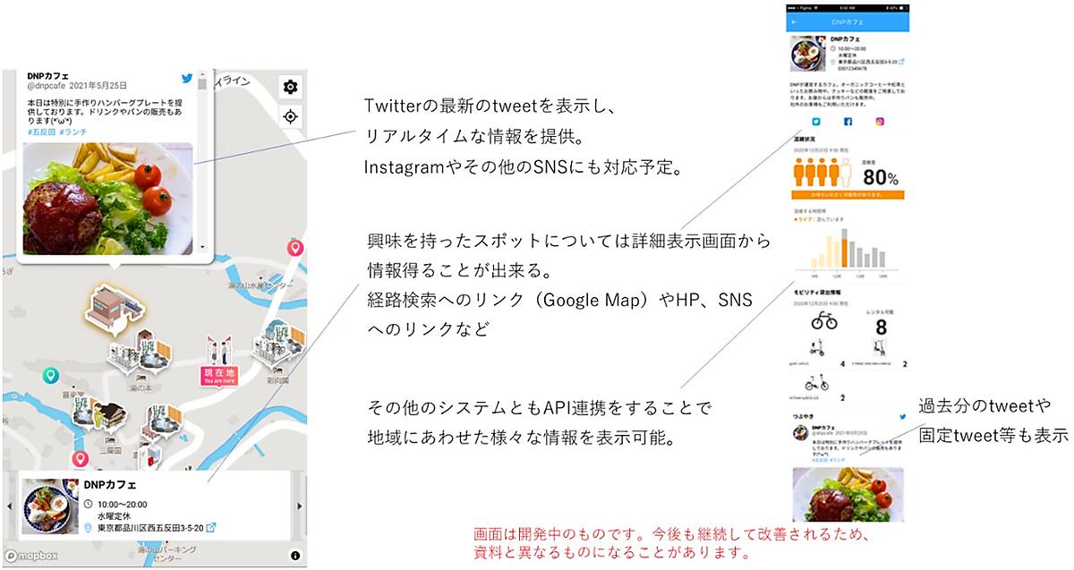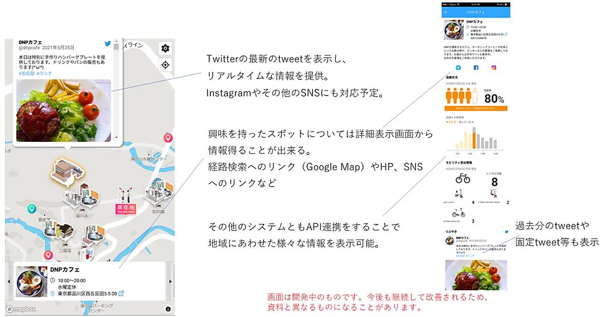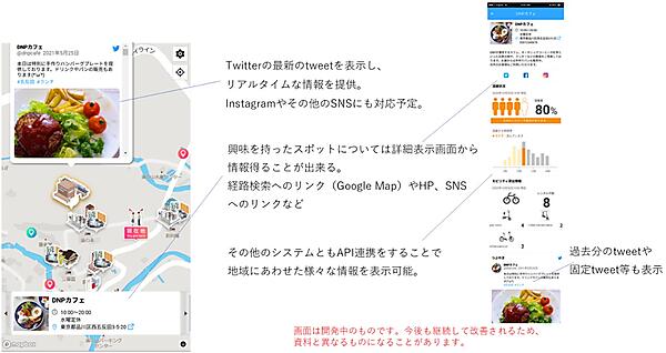 大日本印刷は、デジタル観光マップの「DNP MAPベース地域振興情報発信プラットフォーム」を開発した、と11月8日に発表した。地理に不慣れでも直観的にわかりやすい地図をベースにSNSの「Twitter」と連動して観光情報などをリアルタイムに提供する。12月には「Instagram」に対応予定。情報提供する地域の観光スポットや店舗の新規情報登録の負荷を増やさず、日常的に使用するSNSを活用して手軽に最新情報を発信できる。
