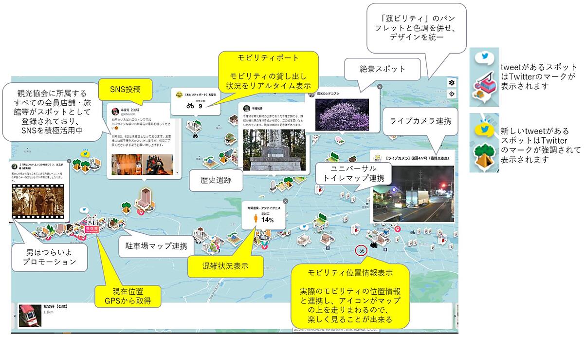 SNS以外のシステムと連動して混雑状況やライブカメラ映像、貸自転車などモビリティの位置情報も提供できる。観光客が最適な行動を選択し、地域の魅力に効率よく触れられるようにしていく。このサービスを採用した三重県菰野町(こものちょう)観光プロモーションでは、自治体の地域情報や事業者の観光地情報、認定された生活者のコメントなどのTwitter投稿に連動して、Webサイト上の菰野町観光情報に最新情報を提供している。