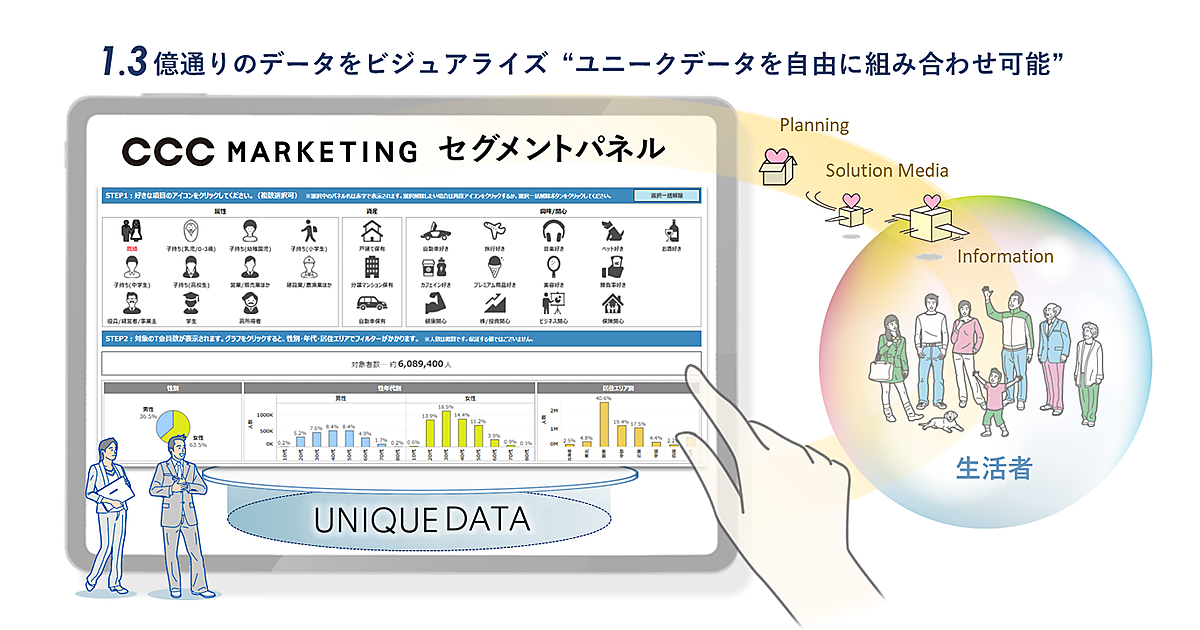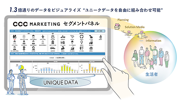 カルチュア・コンビニエンス・クラブ(CCC)グループでマーケティングソリューション事業のCCCマーケティングは、ビジュアル分析プラットフォームの「Tableau」を用いた「セグメントパネル」の提供を始めた、と11月8日に発表した。あらゆる業種業態の企業に向けて、7000万人の性年代やエリア、属性、興味関心のユニークデータを自由に組み合わせ、事業やサービスに沿った1億3000万通りの顧客規模をビジュアルに確認できる。