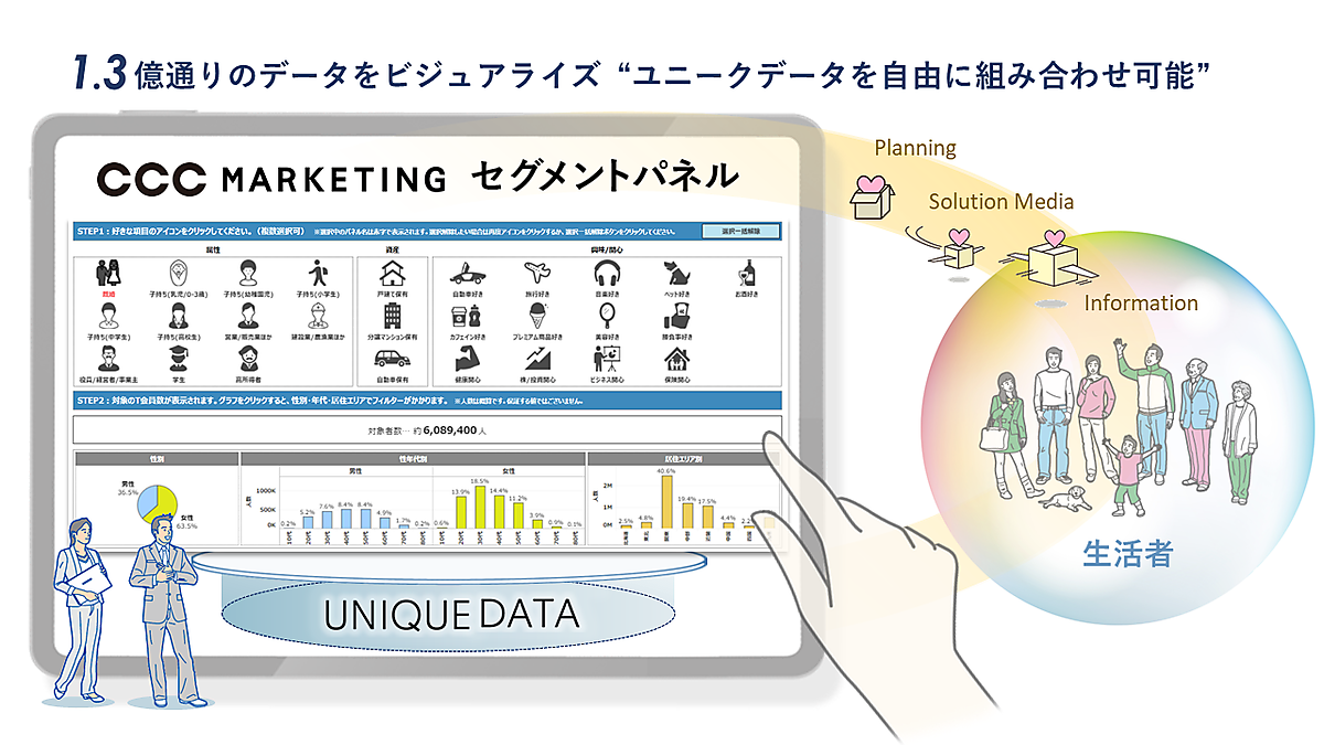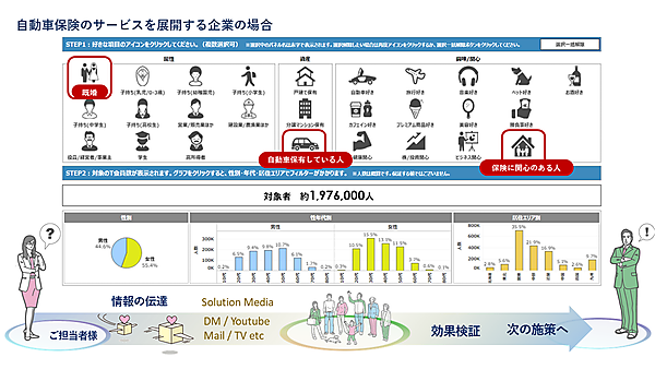 セグメントパネルと、CCCマーケティングの各種ソリューションメディアを用いて、食品飲料・消費財メーカーや不動産、通販、金融保険、小売、サービス業などあらゆる企業にマーケティング支援も提供する。学習塾なら属性「既婚」と「子持ち(小学生)」を掛け合わせたパネルへ郵送型DMを送付する。自動車保険なら属性「既婚」と資産「自動車保有」、興味関心「保険」を掛け合わせ、テレビCMやデジタル広告でアプローチできる。