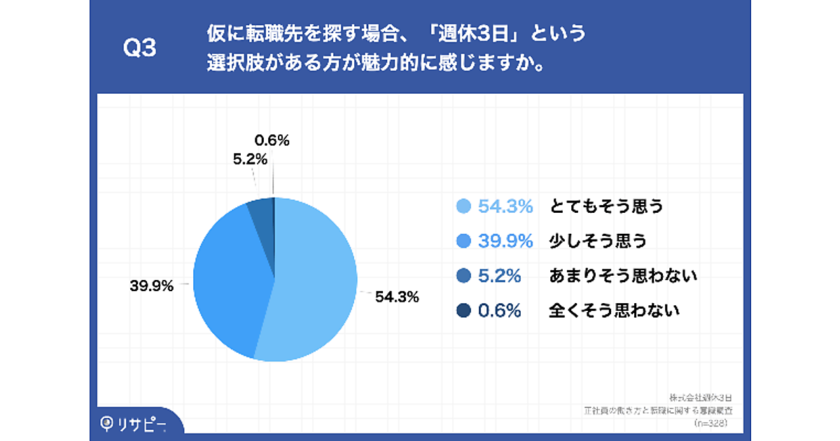 そのうえで「転職先を探す場合、『週休3日』という選択肢があるほうが魅力的に感じるか」と質問すると、「とてもそう思う」54.3%、「少しそう思う」39.9%と、9割以上が肯定的に捉えていた。