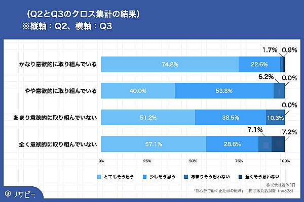 また、これらの回答を「仕事に取り組む態度」について、「かなり意欲的に取り組んでいる」「やや意欲的に取り組んでいる」「あまり意欲的に取り組んでいない」「まったく意欲的に取り組んでいない」の4層ごとに集計し直すと、仕事に意欲的に取り組んでいる人ほど、週休3日の選択肢がある転職先に魅力を感じていることが明らかとなった。