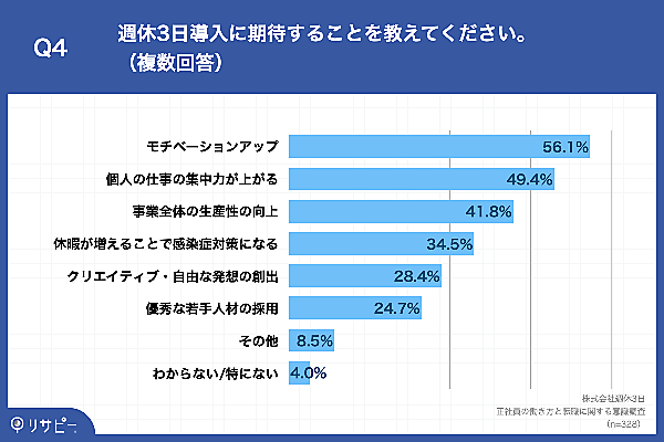 そこで具体的に「週休3日に期待すること」を聞くと、「モチベーションアップ」56.1%、「個人の仕事の集中力が上がる」49.4%、「事業全体の生産性の向上」41.8%が上位となった。自由回答でも「給与はそのまま」「モチベーションを維持しながら高める挑戦ができる」「家族との時間、旅行などで仕事と生活を両方充実させられる」といった意見があがった。趣味や副業、家族との時間を増やしたい、という願望が根底にあるのがわかる。