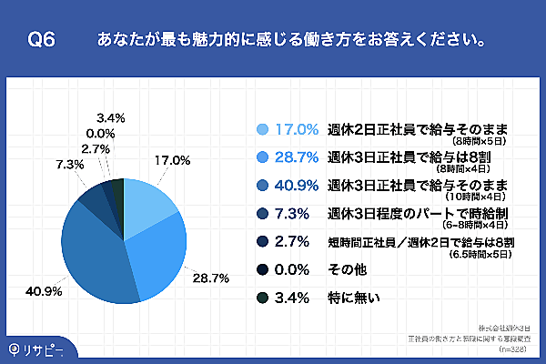 なお働き方のパターン別で「もっとも魅力的に感じる働き方」を聞くと、「週休3日正社員で給与そのまま(10時間×4日)」40.9%で最多だったが、「週休3日正社員で給与は8割(8時間×4日)」28.7%も3割近く存在した。「給与が下がってもいいので、週休3日制」を望んでいる人も決して少なくないようだ。