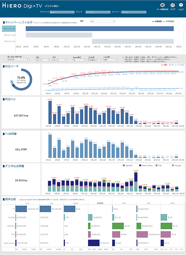 MIEROには、両社がこれまで展開してきたデジタル広告モニタリングシステム「EASI Monitoring」とテレビCM効果可視化システム「レスポンスコネクター」を統合する。MIERO Digi×TVは、テレビCMとデジタル動画広告の統合管理とマーケティング統合分析を実現。1つのメディアと捉え、統合リーチの算出、エリア・性・年代ごとのリーチの可視化が日次単位で可能になる。