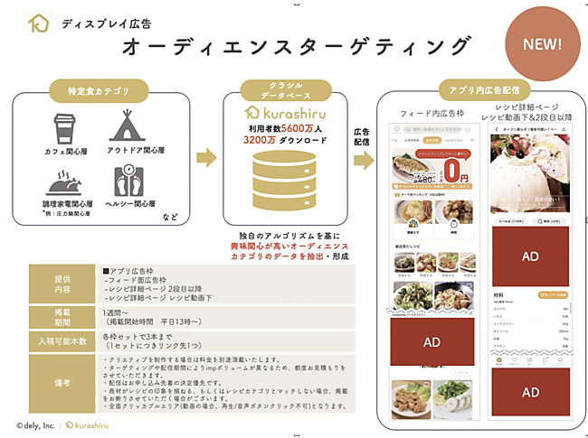 レシピ動画サービスや女性向けメディアを運営するdelyは、同動画サービス「クラシル」で新しい広告プラン「オーディエンスターゲティング」の展開を始めた、と11月11日発表した。食材、料理カテゴリなどのレシピ情報と、検索・動画閲覧データ、お気に入りなどユーザーの行動データを生かし、特定の食カテゴリに興味・関心がある層に広告を配信する。